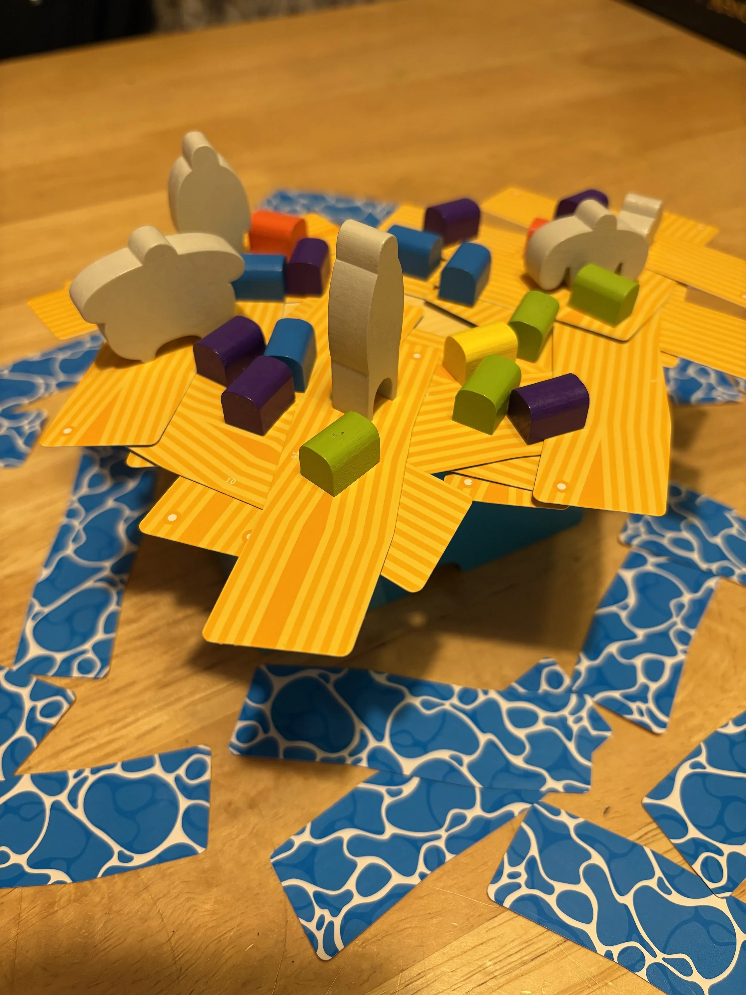 On their turn, they take a piece of the ocean, flip it over to its plank side and place it on the raft. They pick up one of the five rafters, or boaters, and use the rafter to secure the plank. They also place one of their treasure boxes on the plank. If they knock anything into the ocean, it stays in the ocean, unless it’s a treasure box, then it goes in their penalty zone. And then they usually end up flipping the whole table in a rage. So it’s fun for everyone.
